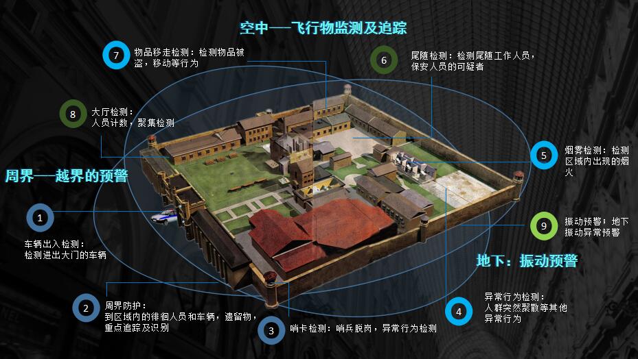 構建以人工智能視覺識別為支撐的立體防衛安全系統,實現空中到地下的安全預警體系。